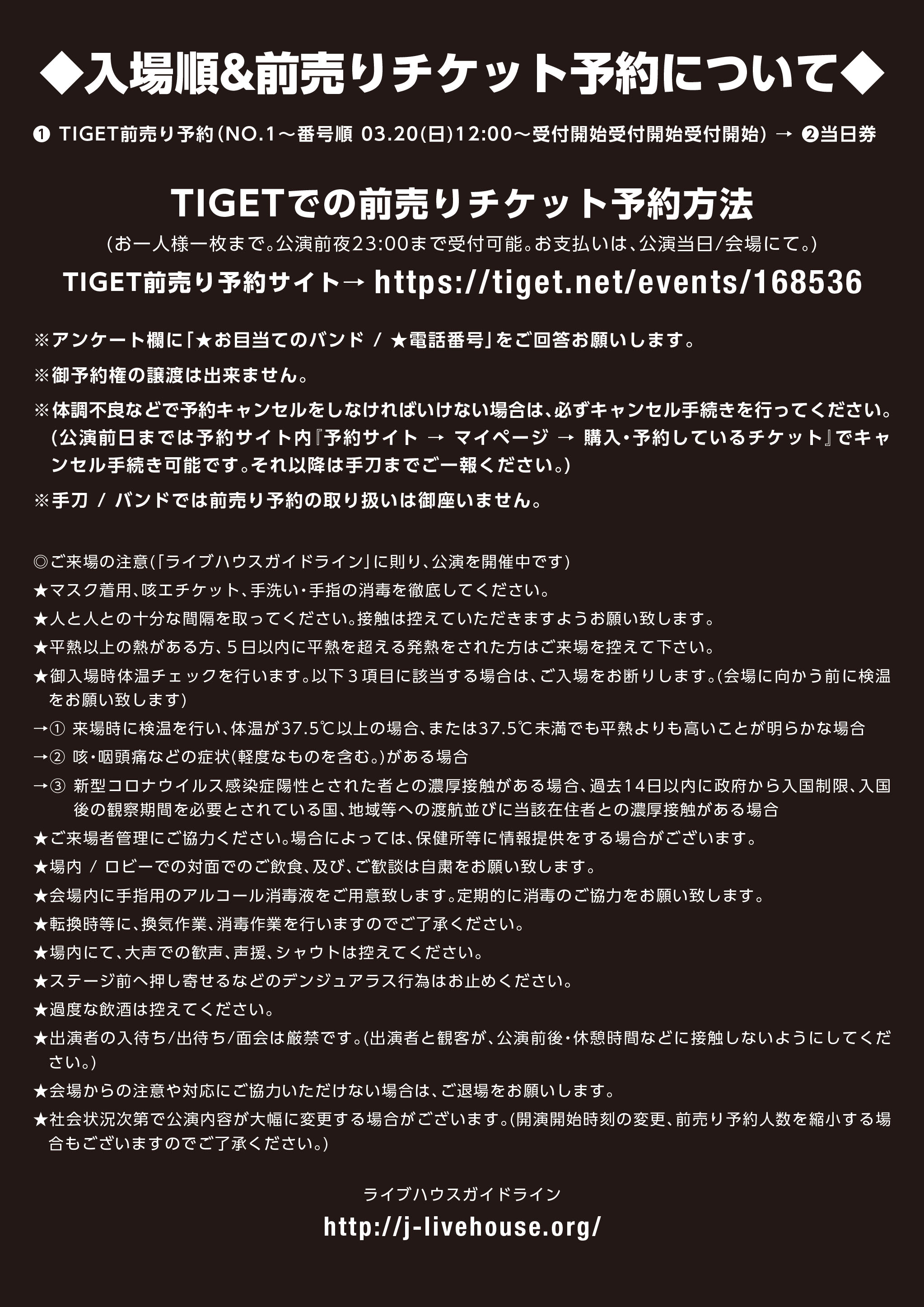入場順&前売りチケット予約;[1].TIGET前売り予約(NO.1~番号順 *03.20(日) 23:00~受付開始受付開始受付開始) → [2].当日券